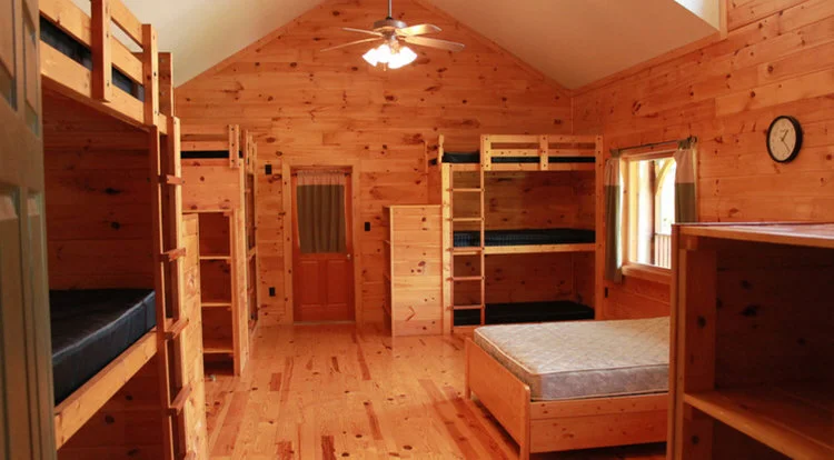 There are 4 main cabins with a total of 24 cabin bedrooms. Each bedroom has 12 twin beds (bunk style) and 1 queen bed in the middle of room. Each bedroom shares a bathroom with another bedroom. Additionally, we can provide another 3 mattresses per bedroom for overflow bringing our total cabin bedroom capacity to 384 guests.